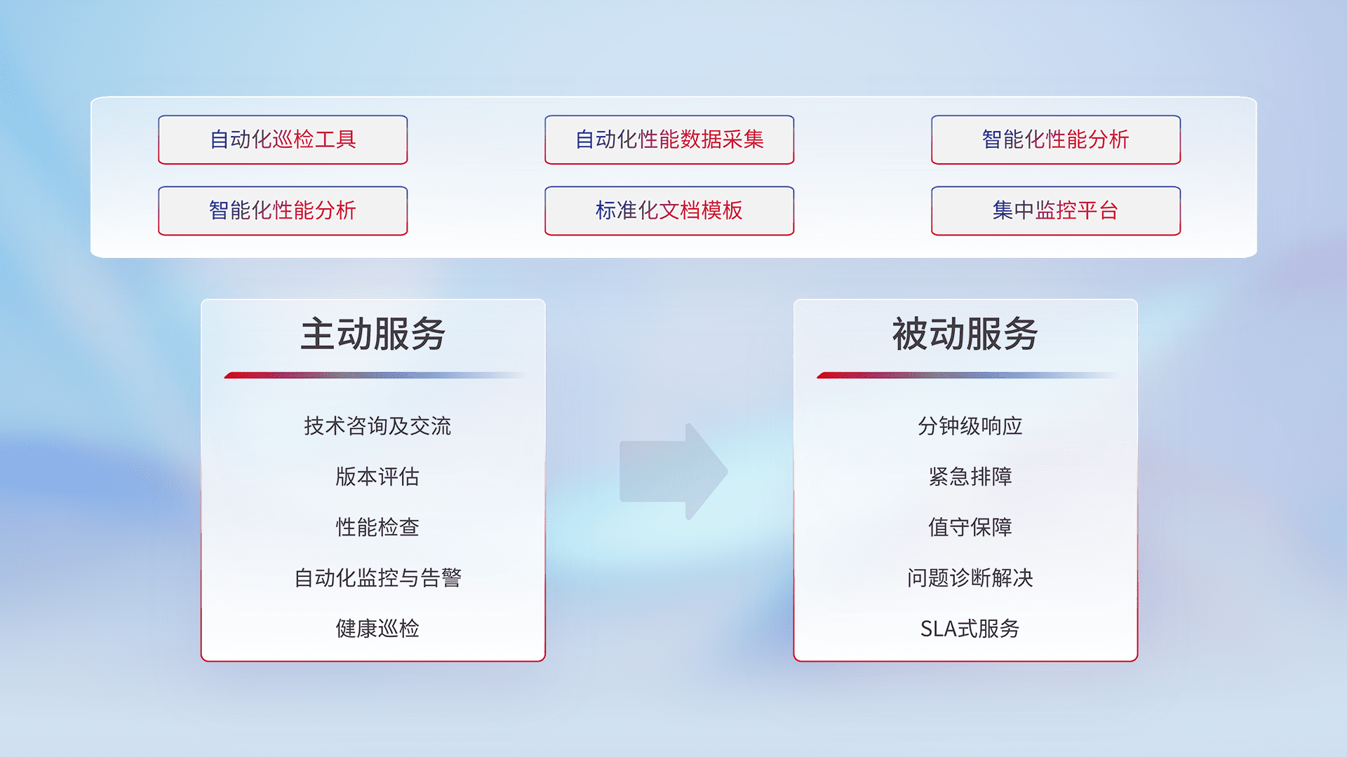 智能化工具和标准化文档,,,保障服务质量,,,,提供主动服务(包含技术咨询、、、版本评估、、性能检查、、、、自动化监控与告警、、、健康巡检)和被动服务包含(分钟级响应、、、紧急排障、、、、值守保障、、、问题诊断解决、、、、SLA服务)。。